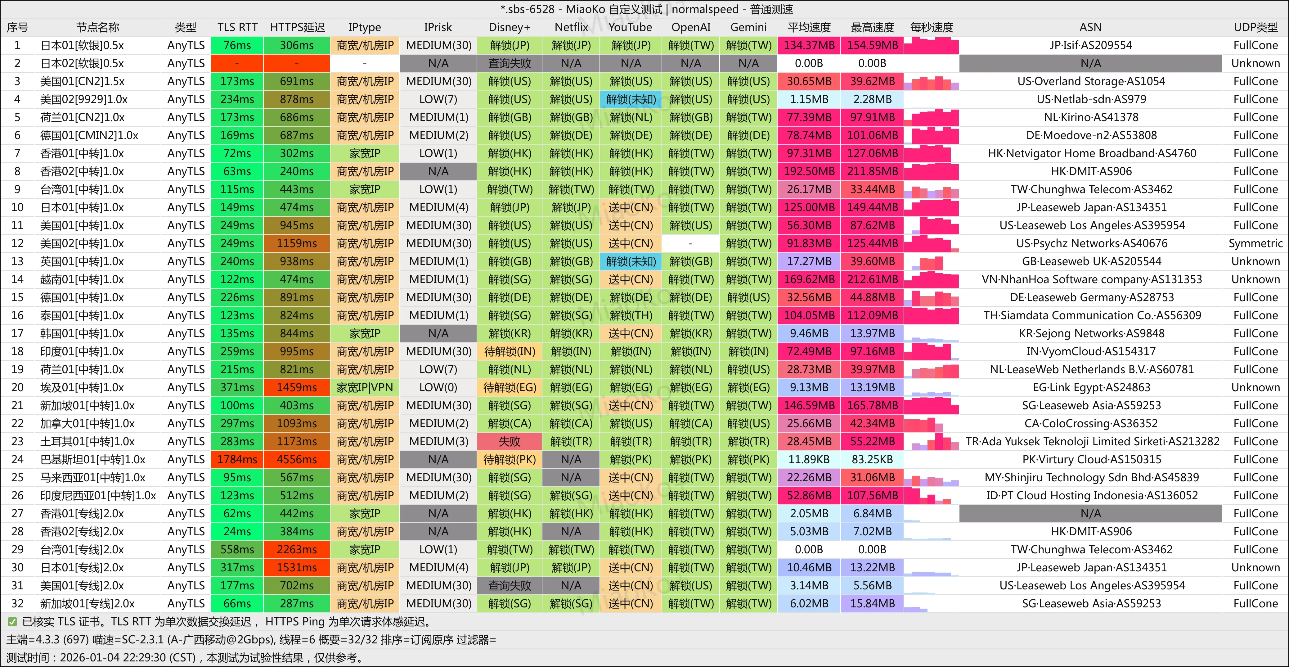 Anytls新协议和tuic协议国内公网中转。2个hy2直连节点。 Anytls新协议跑测速能跑满,tuic因为是基于udp,由于很多地方运营商对udp限速,所以测速跑不满,但是使用足够,老板说是因为有用户说好用所以就留着了,udp主要是更少握手所以延迟会更低且体感会比tcp反应快一点。客户端还有vless协议节点。